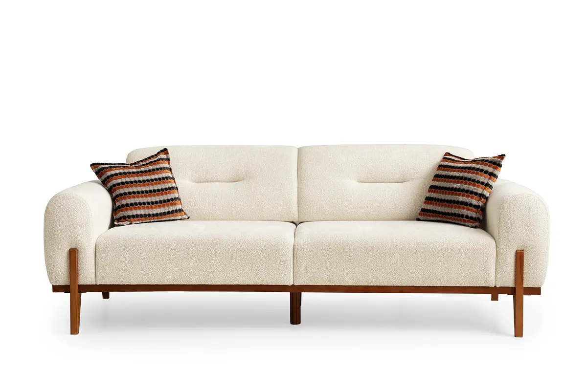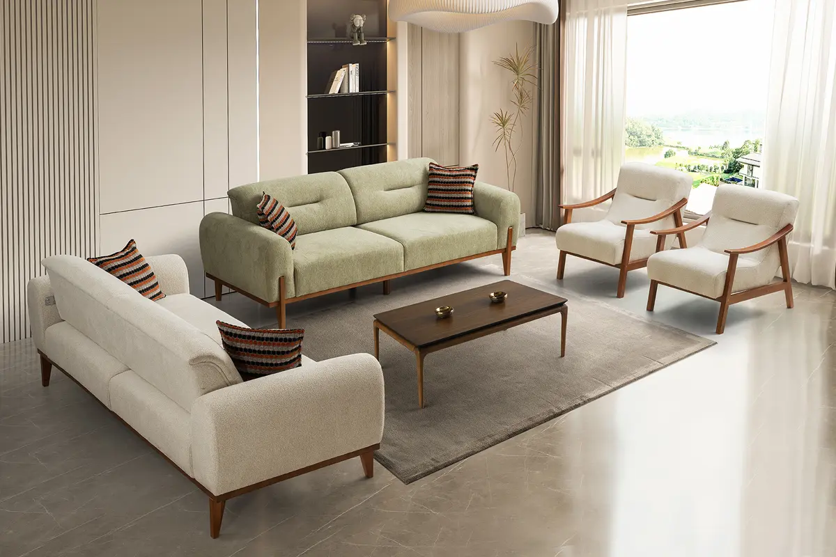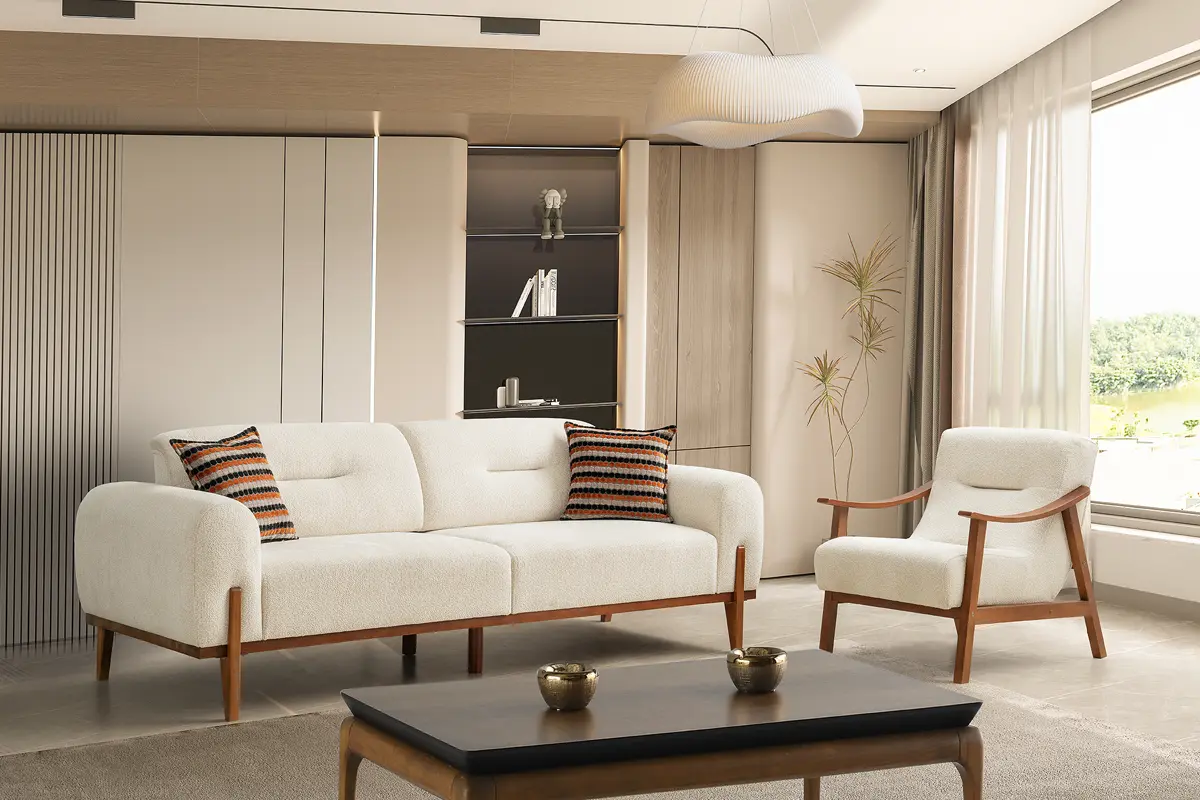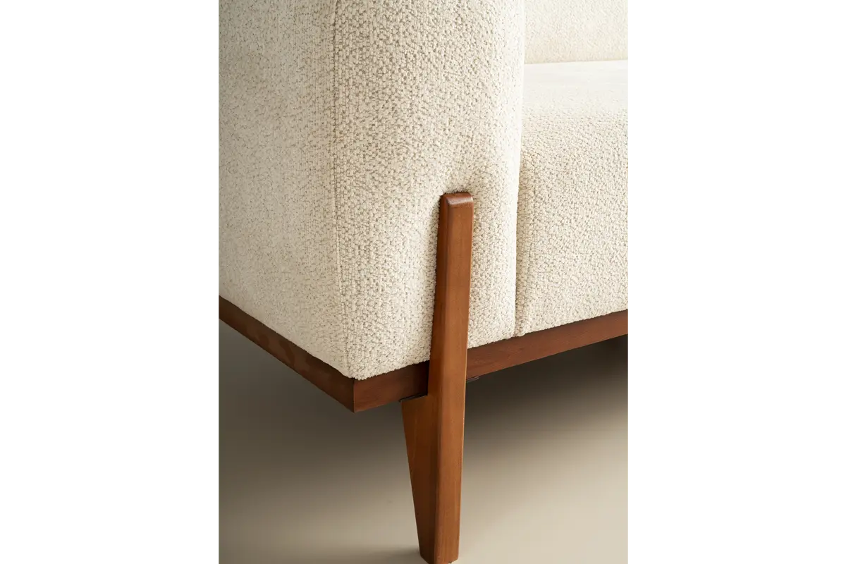 Bohem Koltuk Takımı, modern-bohem estetiğini sıcak ahşap detaylarla birleştiren zamansız bir tasarım sunar. Fırınlanmış gürgen ağacından üretilen iskelet yapısı uzun ömür ve stabilite sağlarken, 34 DNS yoğunluktaki oturum süngeri dengeli yumuşaklık ile form dayanımını bir arada verir. Yerden yüksek kurgulanan masif ahşap ayaklar, robot süpürge ve günlük temizlikte rahat erişim sağlar.