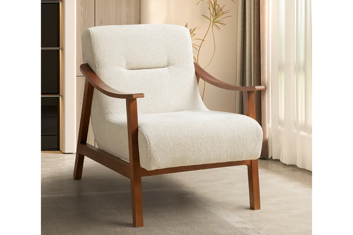 Berjer: Ahşap kollu, ergonomik sırt eğriliği, geniş oturum