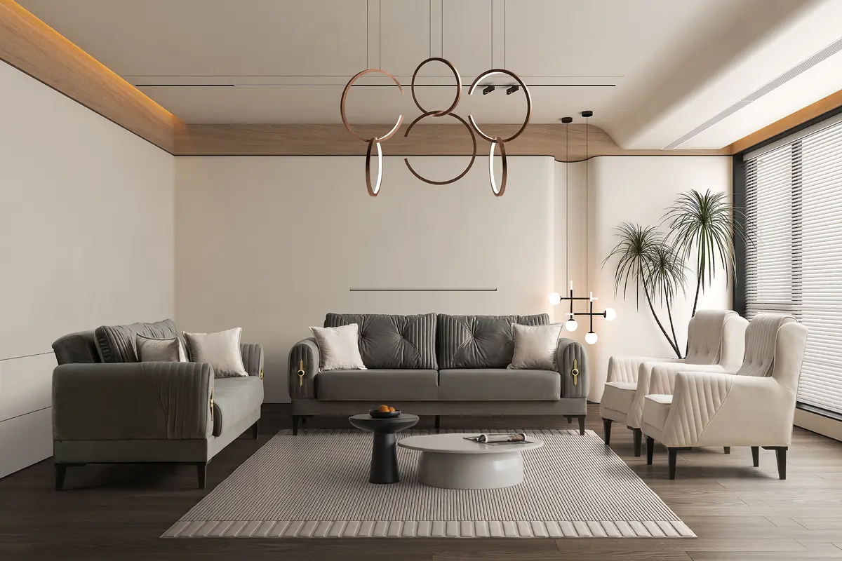 Çeşme Koltuk Takımı, modern-klasik çizgiyi sofistike gold aksesuarlarla buluşturarak salonunuza zamansız bir şıklık taşır. Fırınlanmış gürgen iskelet yapısı ve 34 DNS yoğunluklu oturum süngerleri, yıllarca formunu koruyan konfor sunar. Yerden yüksek konik ayaklar alt temizliği kolaylaştırır; robot süpürgeler rahatlıkla geçer.