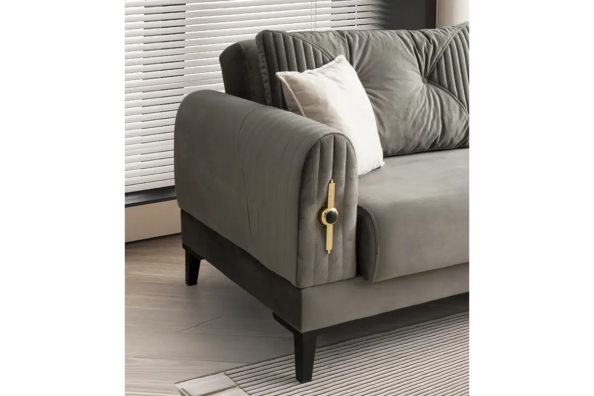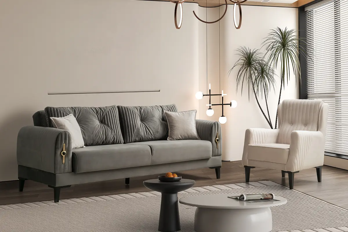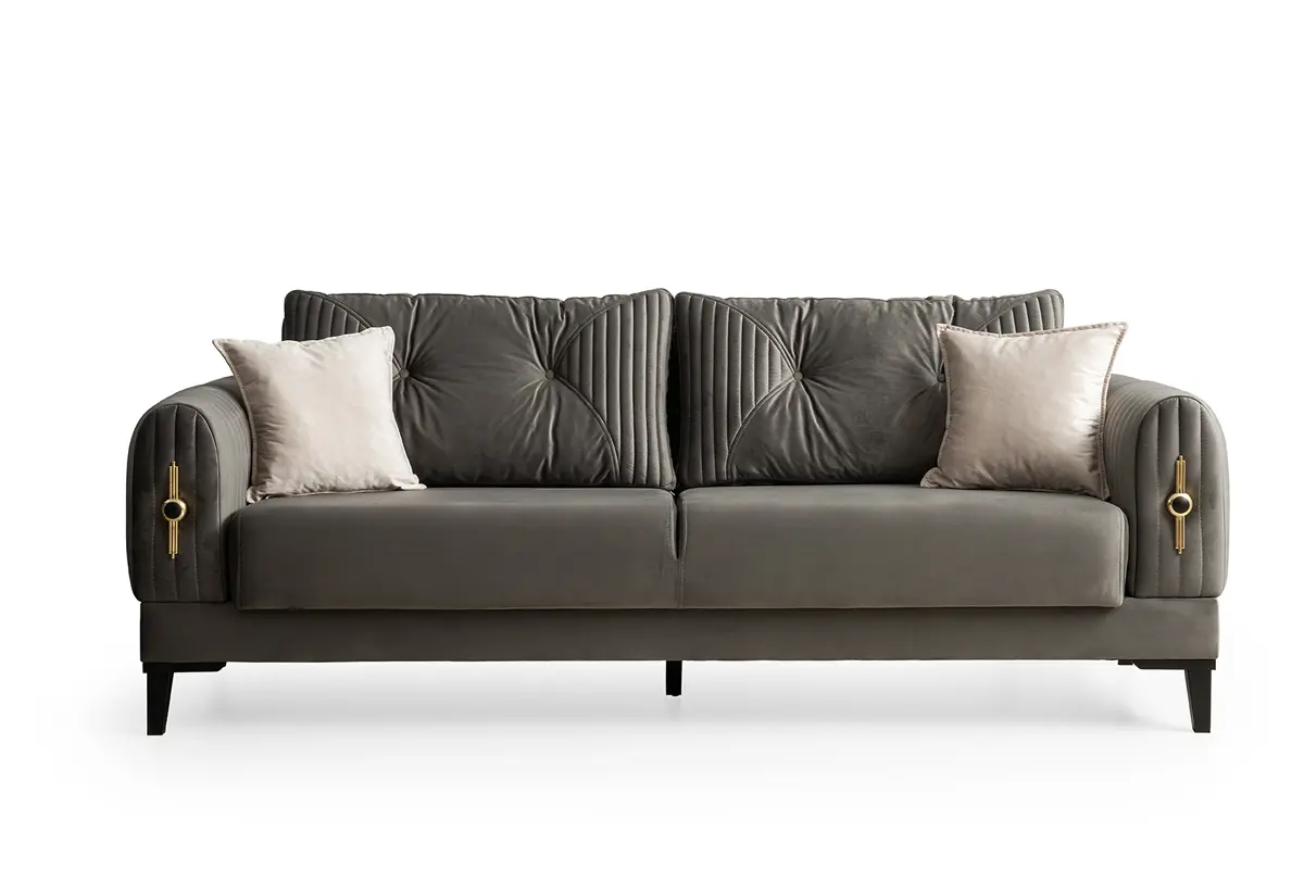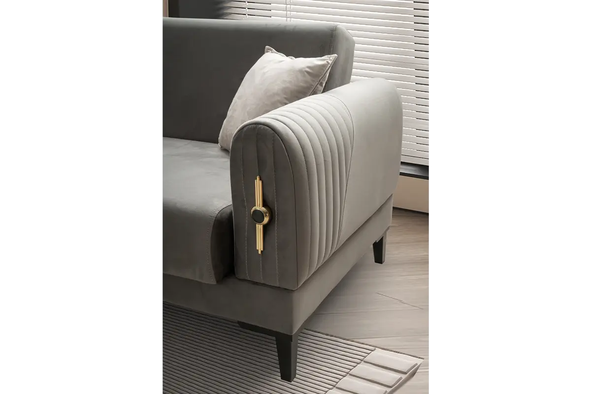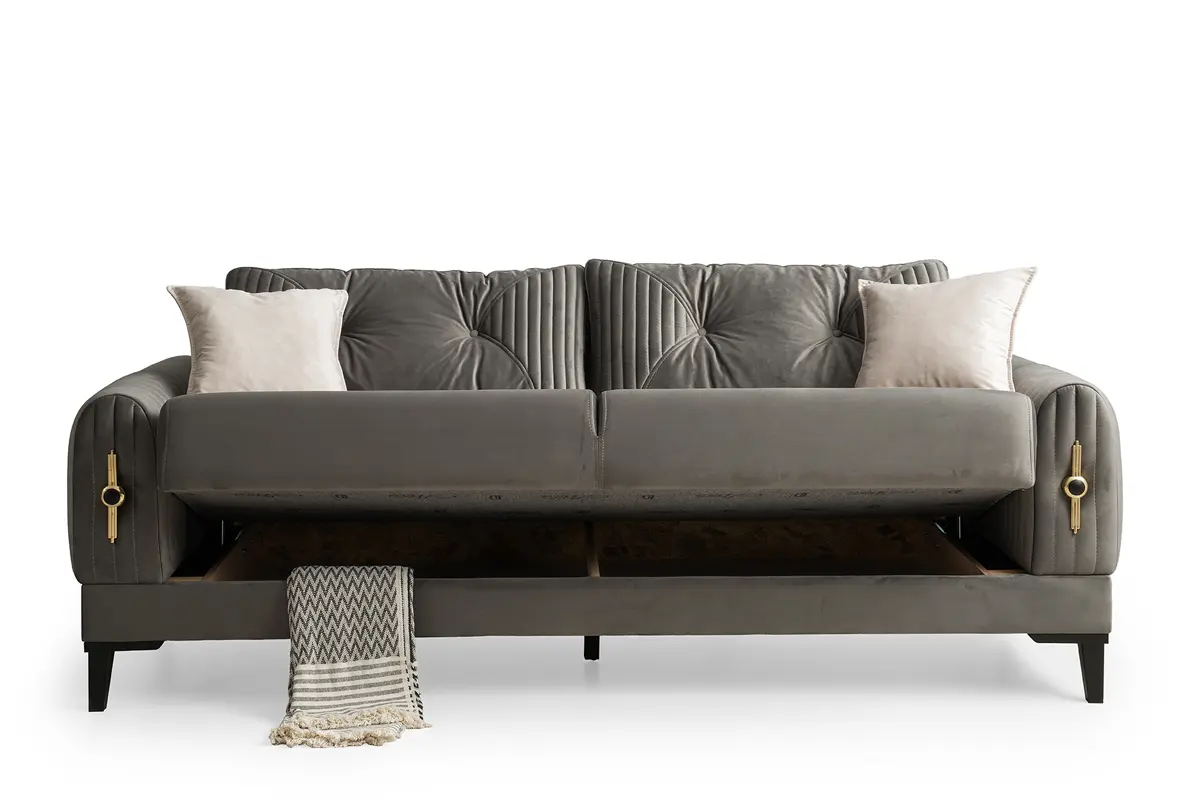 Kollarda dikey kapitone kanallar ve gold rozet-li şık aksesuar, tasarıma mücevher etkisi katar. Sırt minderlerinde merkezden yayılan düğme ve kanal kapitone kombinasyonu görsel ritim yaratır. Üçlü kanepede ileri-geri hareketli sırt mekanizması ile tek hamlede geniş bir uyku alanı oluşur; oturum altındaki sandık bölmesi ise battaniye ve yastıklar için pratik depolama sağlar. Gri ton gövdeyi krem berjerler tamamlar; takım, modern ve klasik dekorasyonlarla uyumlu, sakin ve zarif bir atmosfer oluşturur.