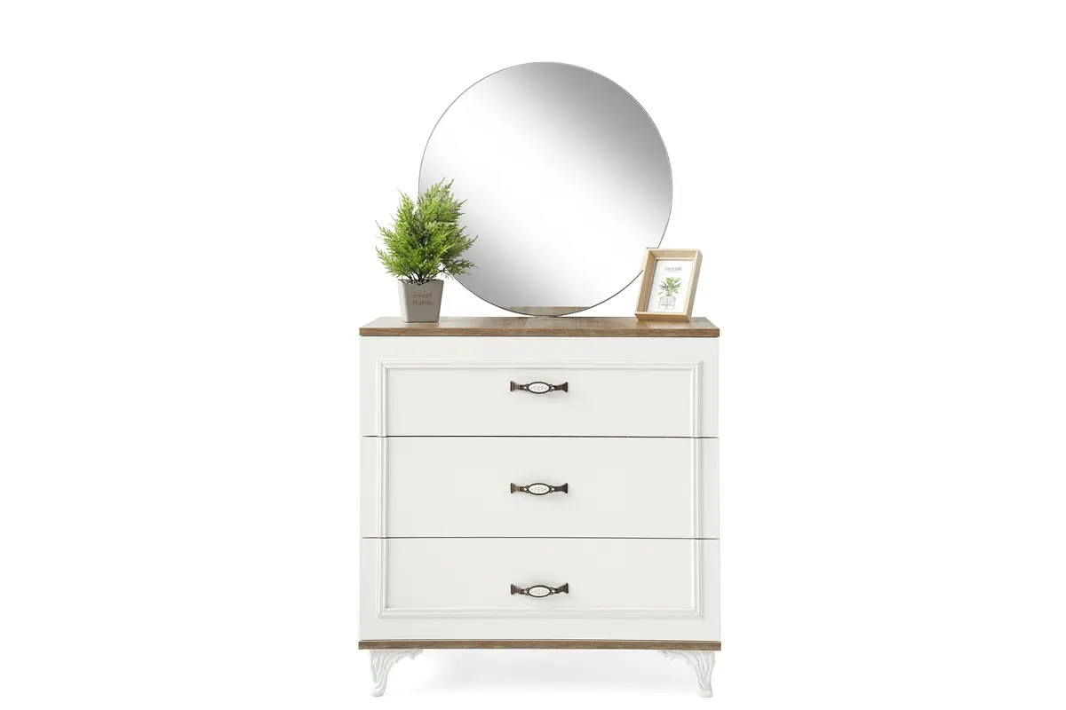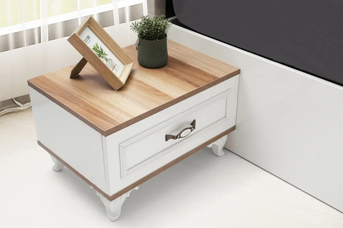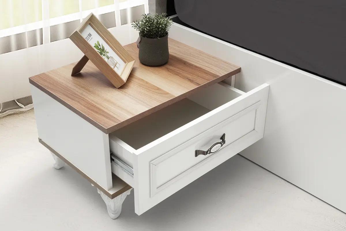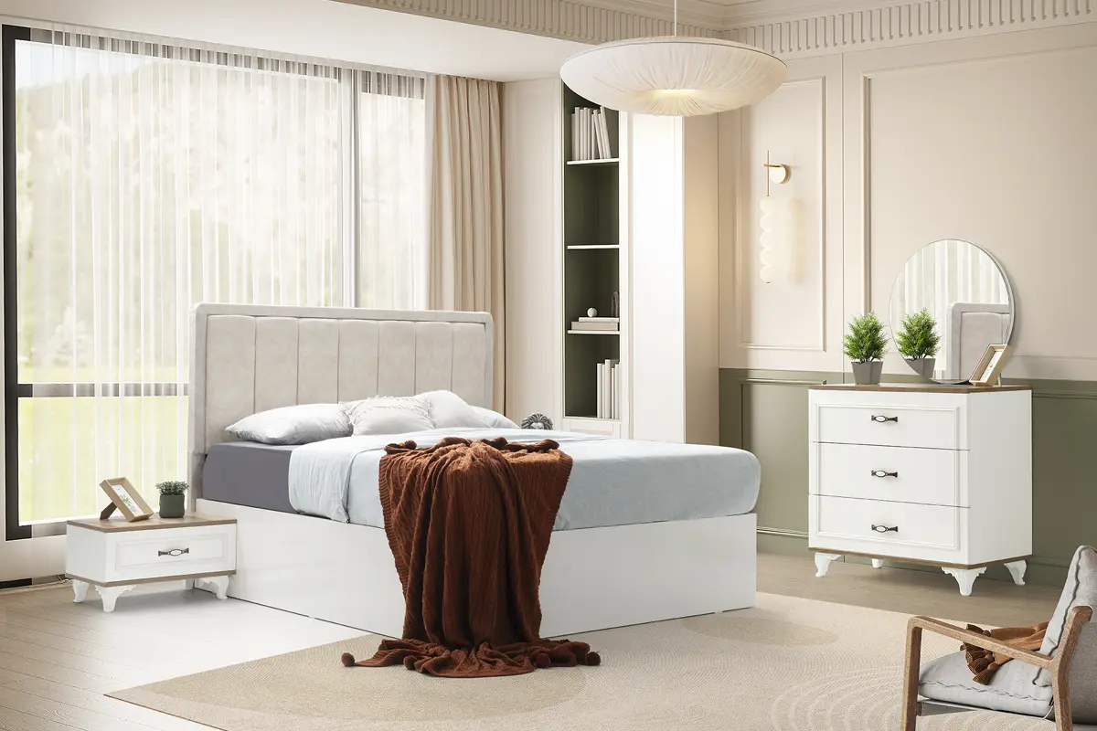 ✦ Komodin ve şifonyerde geniş çekmeceler; tok kapanışlı ray sistemiyle sessiz ve dengeli çalışır.