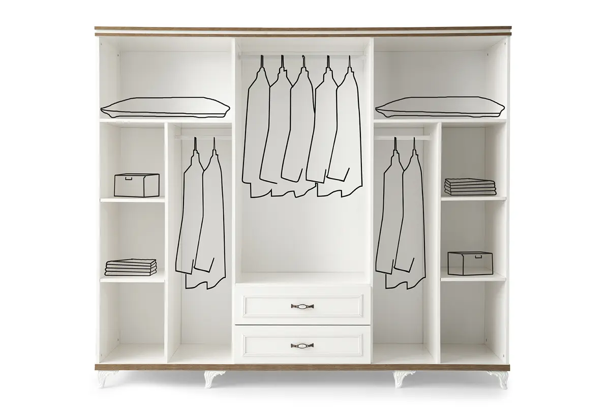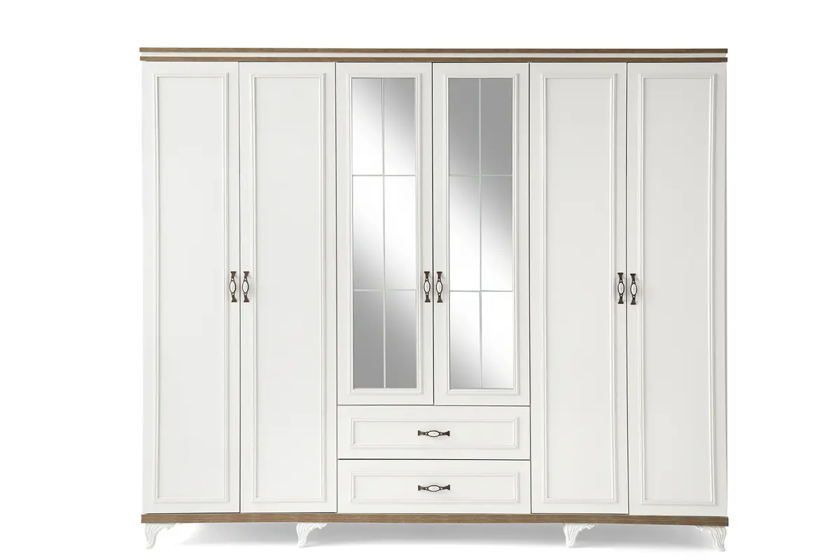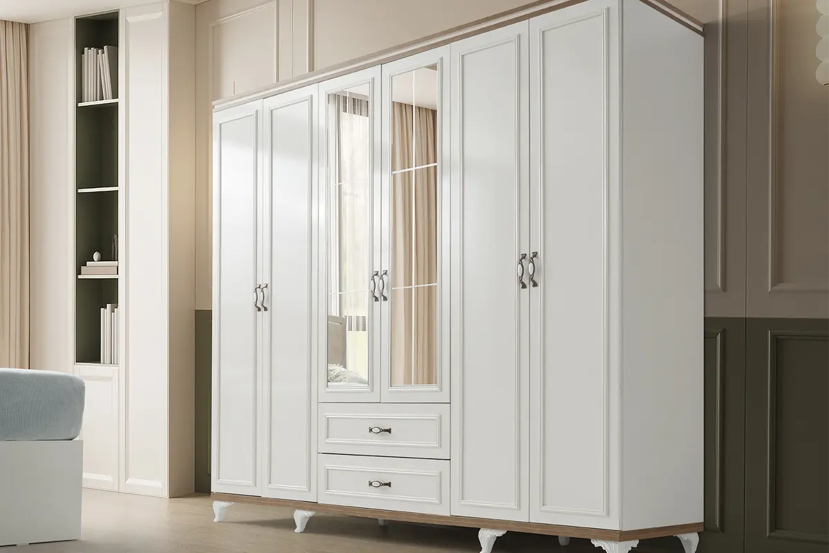 ✦ Geniş kapaklı gardırop; orta bölümde tam boy aynalar, iki adet alt çekmece ve modüler iç düzen (askı borusu/raf) ile maksimum depolama alanı sağlar.