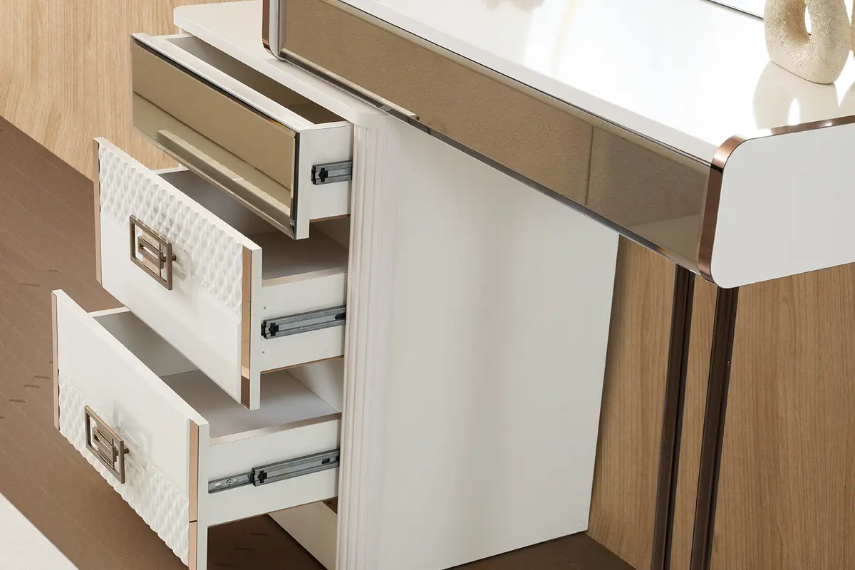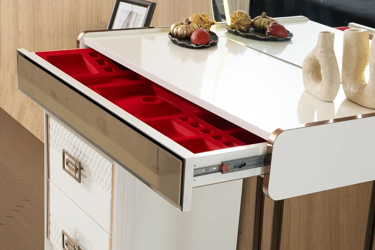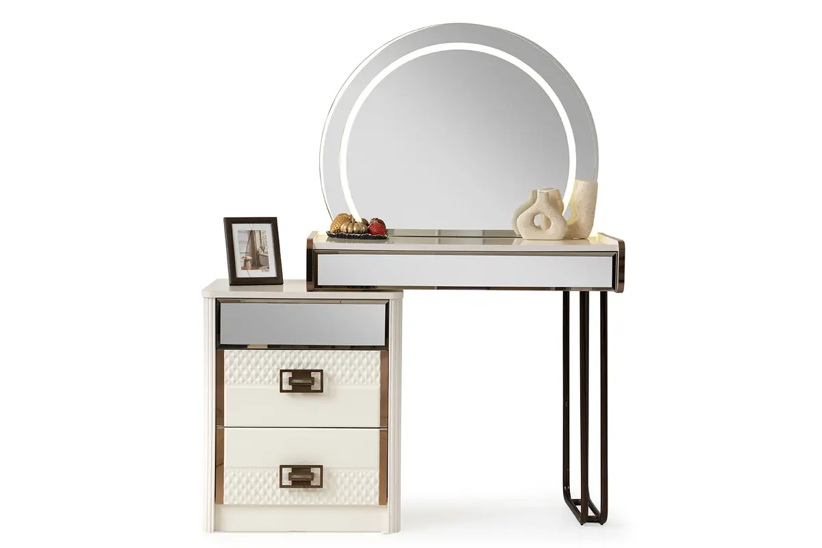 💠Fonksiyonel Makyaj Masası: Özel bölmeli çekmeceleri ve modern yuvarlak aynasıyla hem şıklığı hem işlevselliği bir arada sunar.