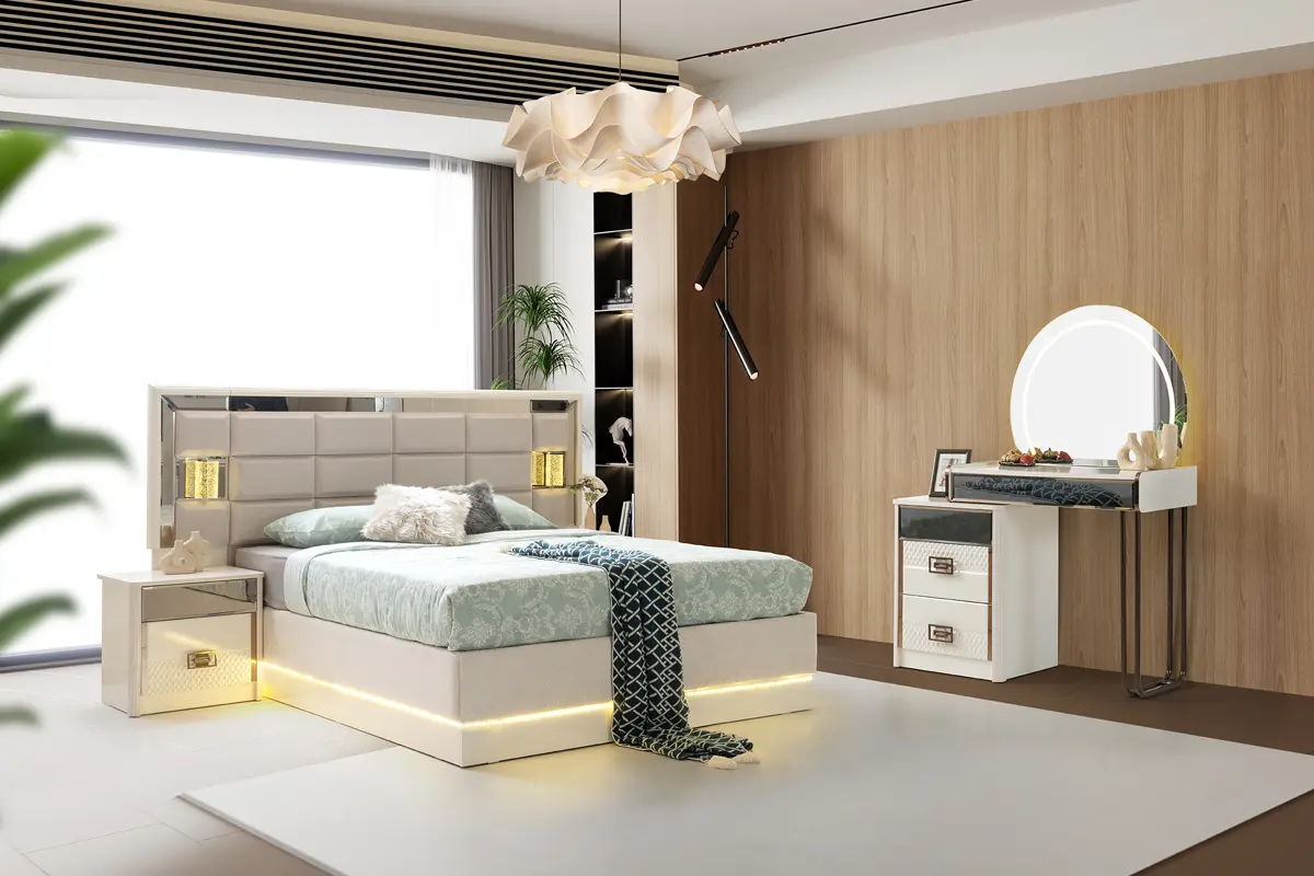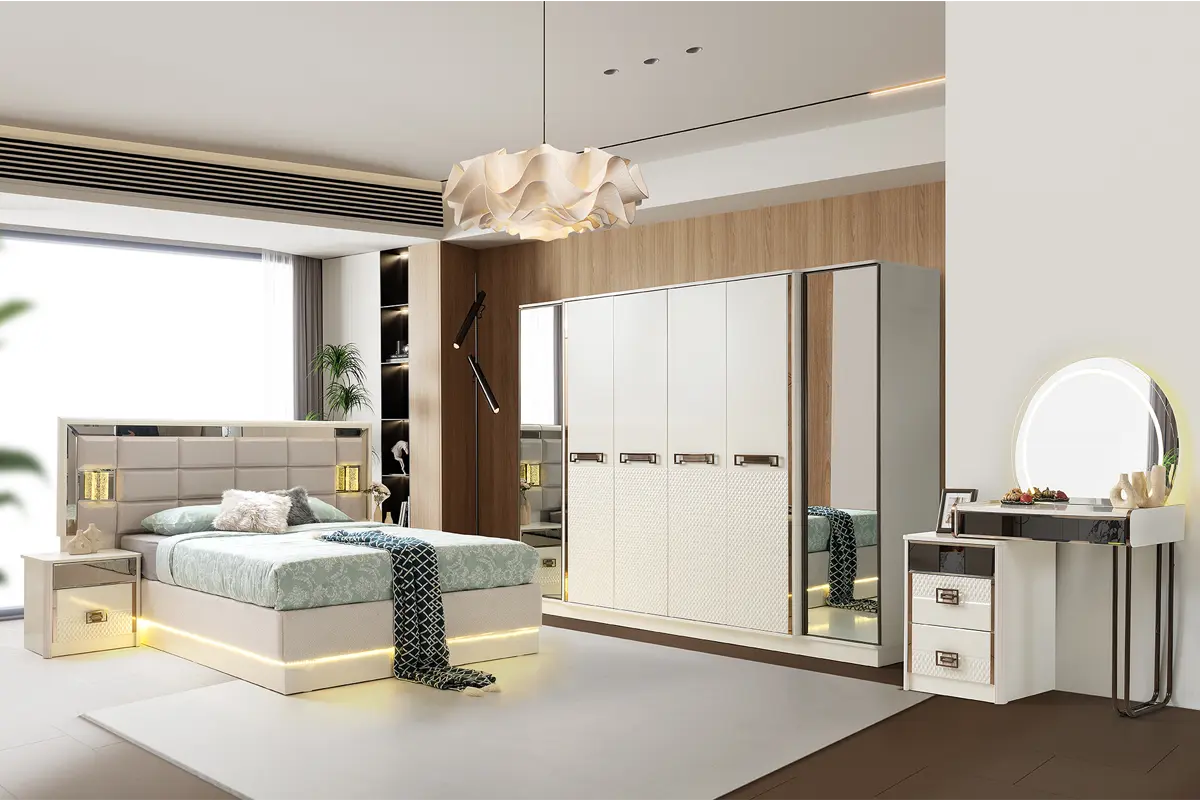 💎 Lüks ve Modern Tasarım: Aynalı gardırop detayları, özel kabartma desenler ve metalik dokunuşlarla göz alıcı bir şıklık yaratır.