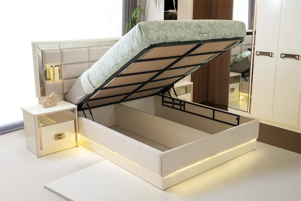 🛋️ Maksimum Depolama İmkanı: Geniş dolap bölmeleri, bazalı yatak, komodin ve şifonyer çekmeceleriyle eşyalarınızı düzenli tutar.