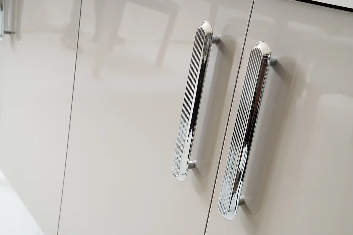 ✦ Soft gri parlak yüzey, ışığı zarifçe yansıtarak mekâna modern ve sakin bir atmosfer katar.