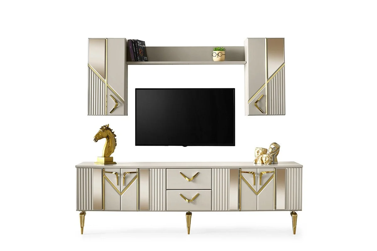 ✦ Şampanya/bej tonlarıyla altın vurguların birleşimi, mekâna sofistike bir lüks katar.