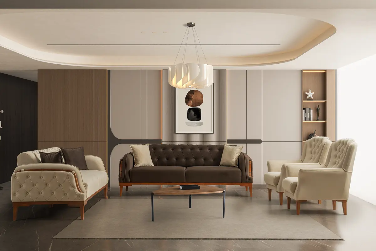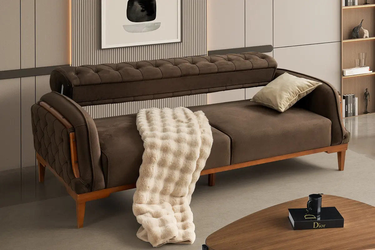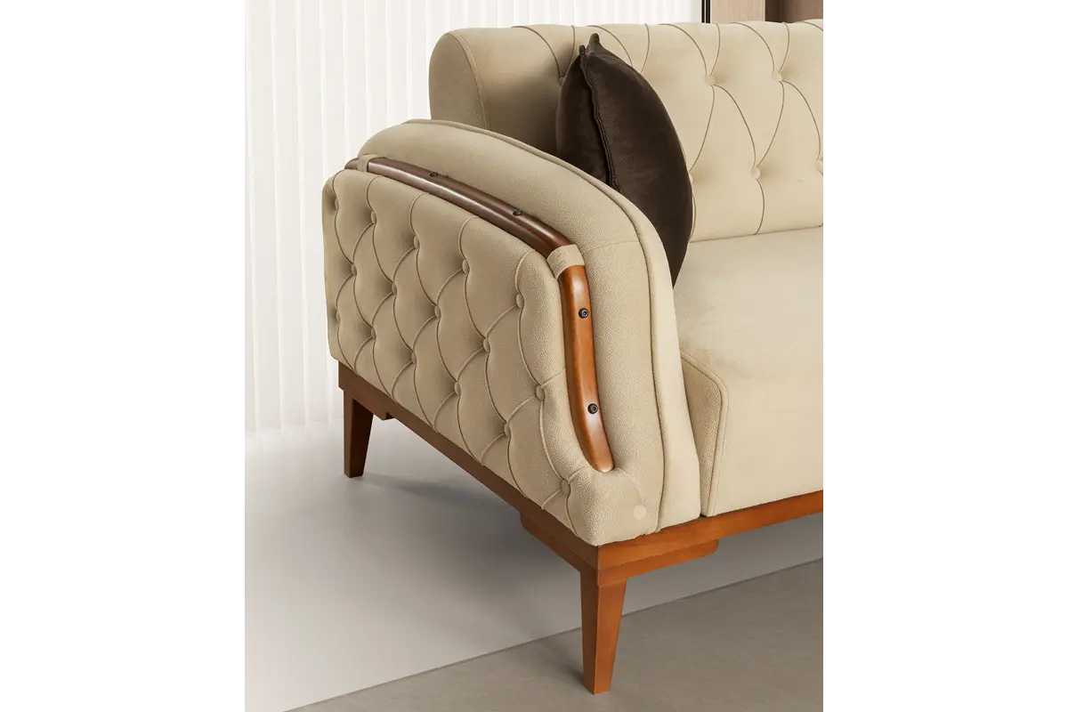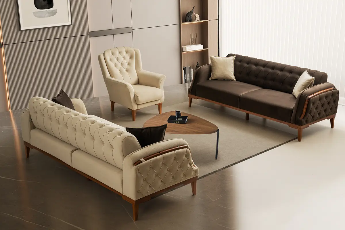 Kolların dış yüzeyindeki el işçiliği kapitone ve masif ahşap şeritler takımın imza detayıdır. Sırt bölümü ileri-geri hareket ederek düz platform oluşturur; üçlü kanepe pratik şekilde günübirlik yatak olur. Koyu kahve ve açık bej tonlarının dengesi, klasikle moderni bir araya getirir; takımın kabarık kapitone başlıklı berjeri ise rahat oturuş ve şık bir tamamlayıcılık sunar.