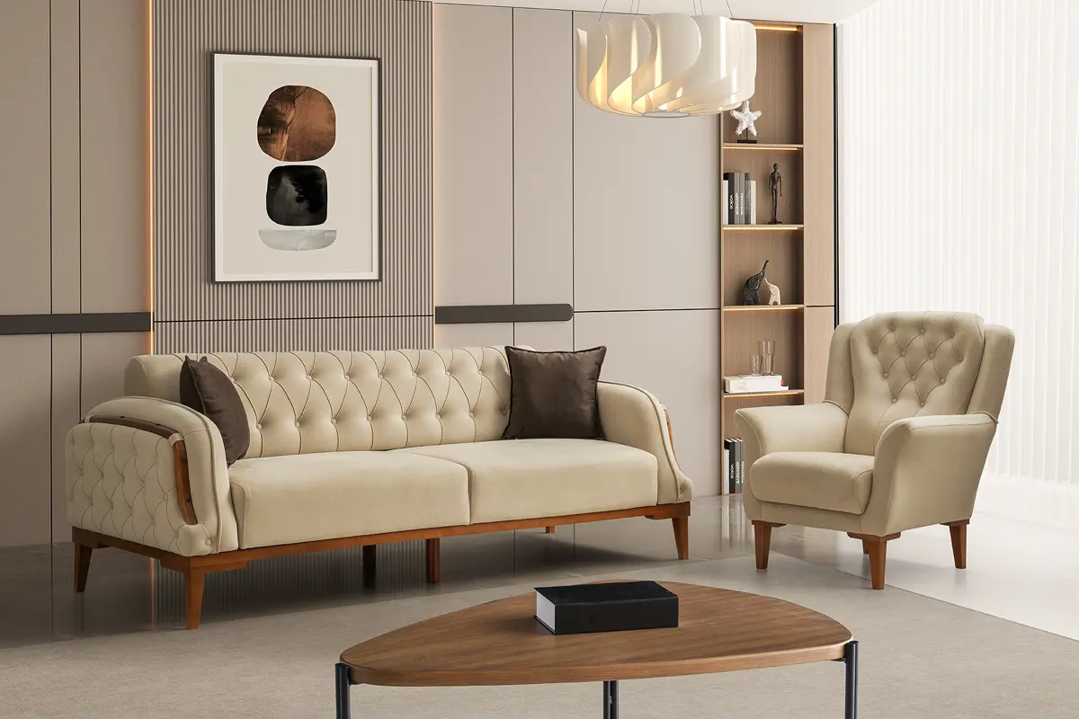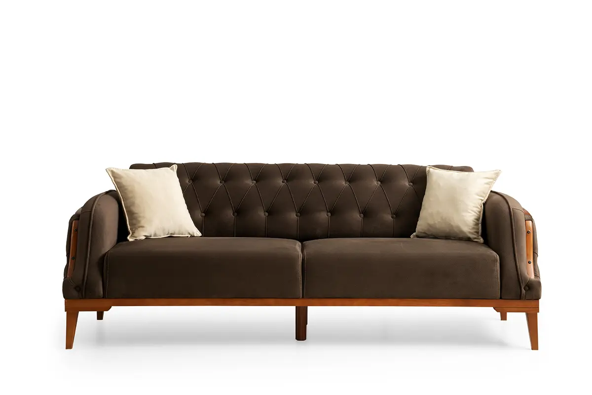 Madrid Koltuk Takımı, zamansız kapitone işçiliğini masif ahşap dokunuşlarla buluşturarak salona sıcak ve sofistike bir karakter kazandırır. Fırınlanmış gürgen iskelet uzun ömürlü dayanım sunarken, 34 DNS yoğunluklu oturum süngerleri göçmeyen bir destek ve konfor sağlar. Yerden yüksek masif ayaklar hem ferah bir görünüm hem de kolay temizlik imkânı verir.