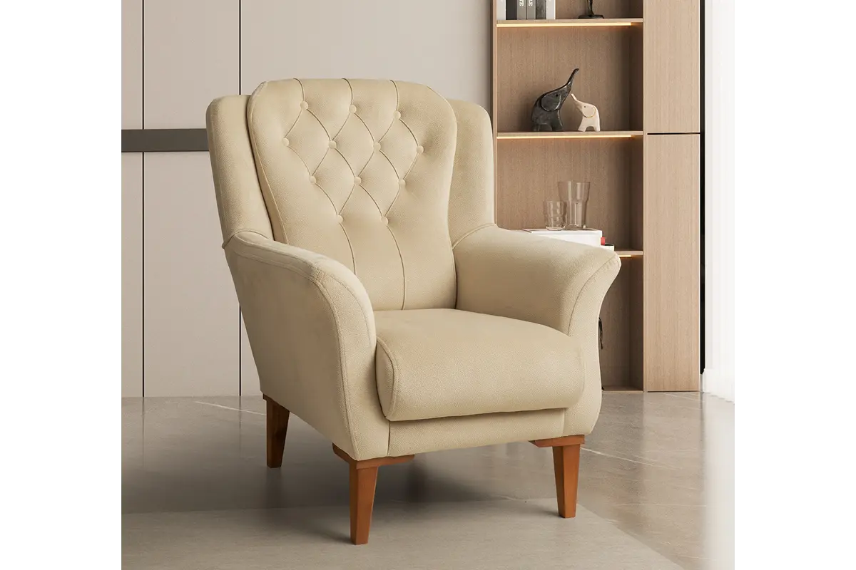 Berjer: Kapitone sırt, kavisli kol formu, masif ayak