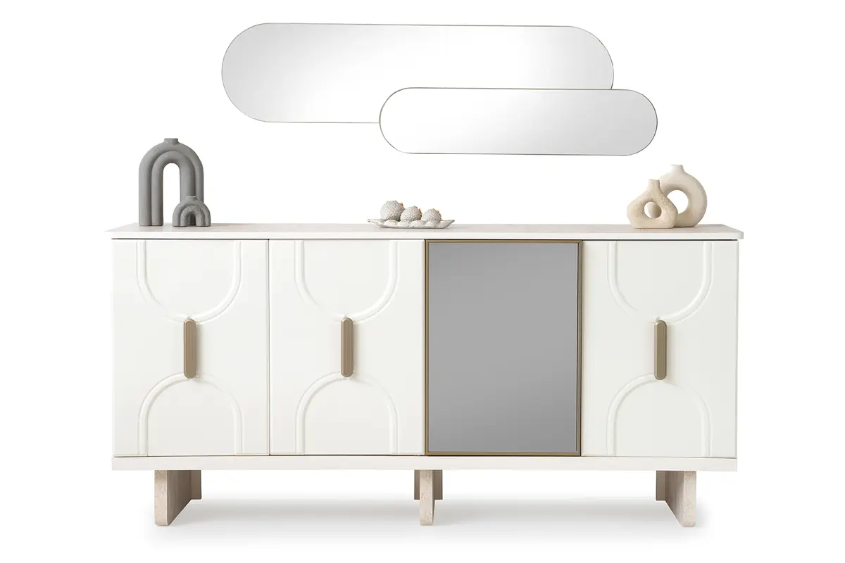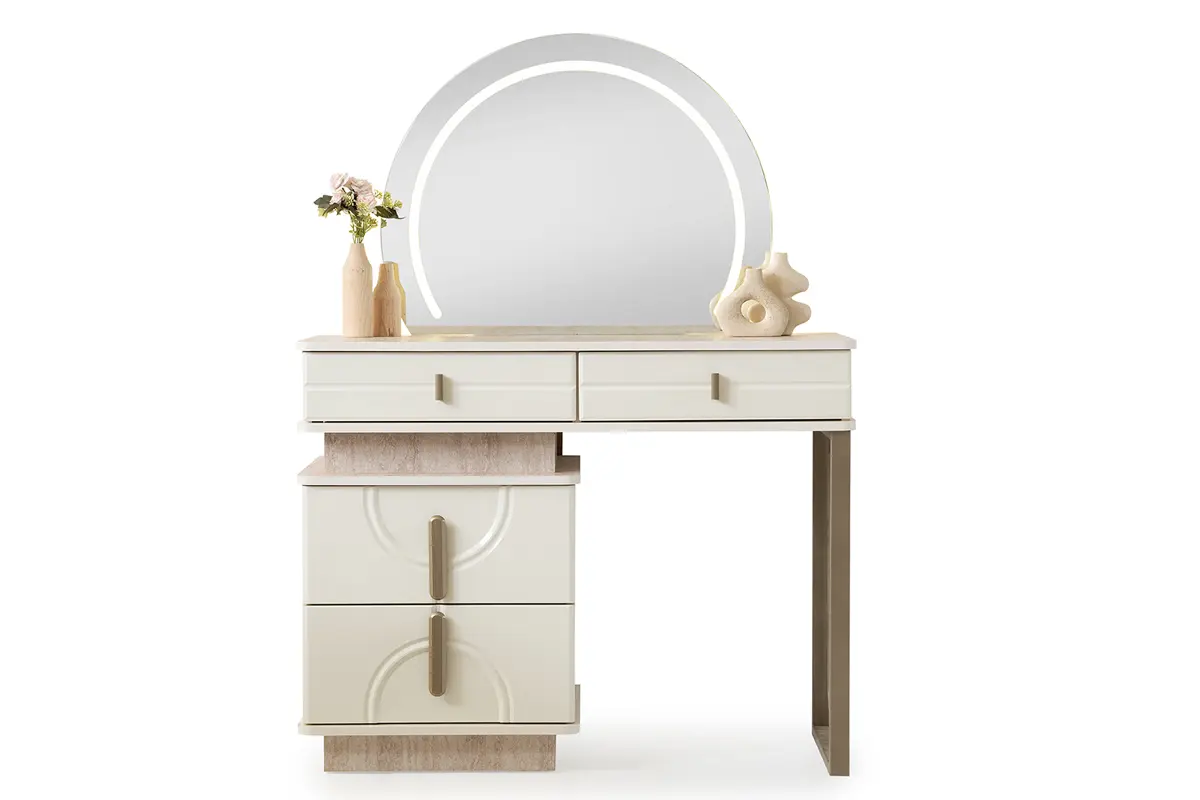 Konsol & aynası: Geniş iç hacim, düzenleyici bölmeler; şampanya vurgulu kulp/ayaklar ve konsepti tamamlayan dairesel ayna.