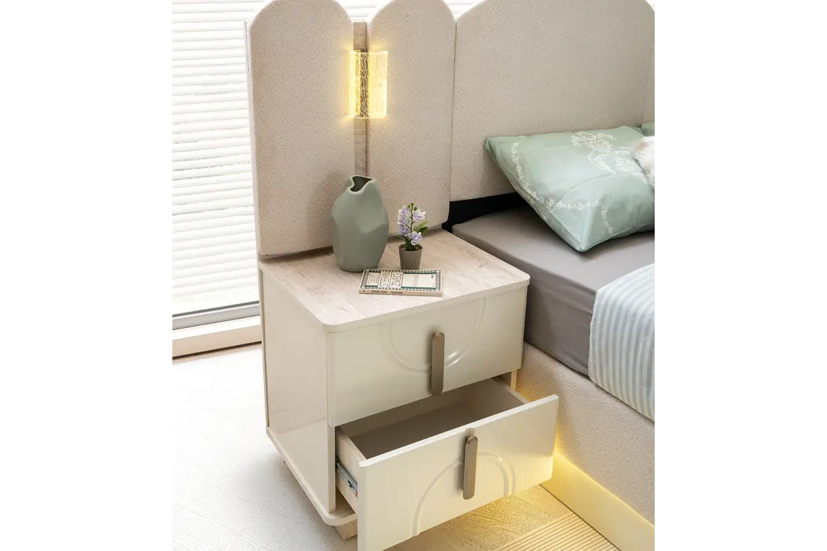 2 komodin: Minimal ön yüzey, pratik depolama ve üst tabla kullanım rahatlığı.