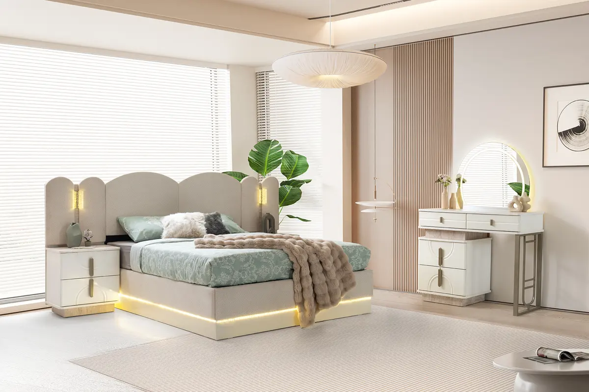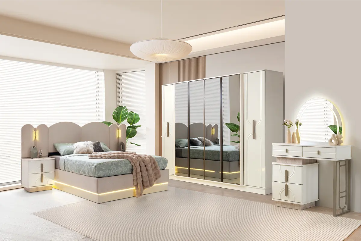 Modern lüksü sıcak dokularla buluşturan Milano; bronz/şampanya metal vurgular, doğal ahşap tonları ve krem döşemelerle evinizde sofistike, uzun ömürlü bir konsept bütünlüğü kurar.