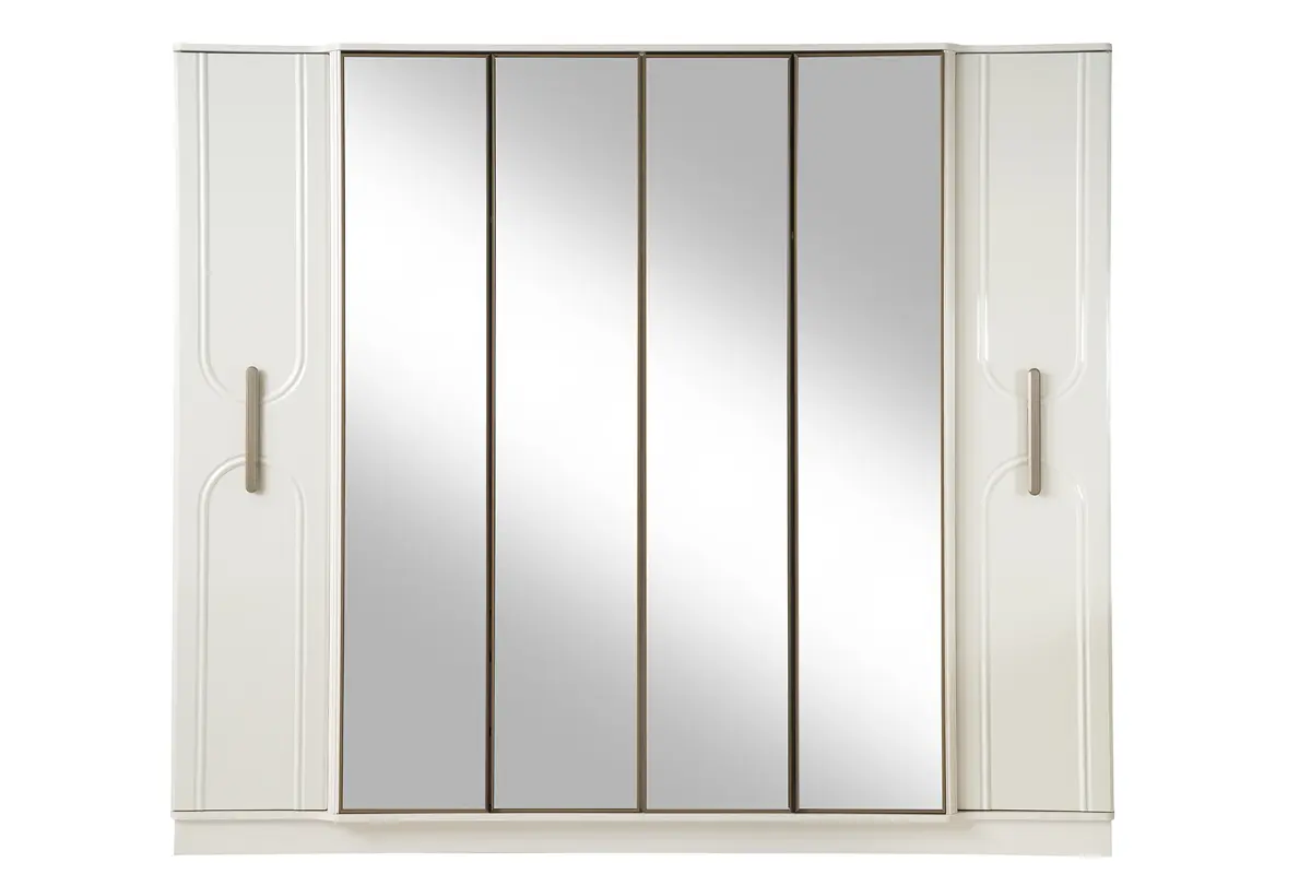 6 kapılı dolap: Aynalı kapak kombinasyonu, askı–raf–çekmece modülleri, aksesuar bölmeleri; sessiz kapanan menteşe/ray.