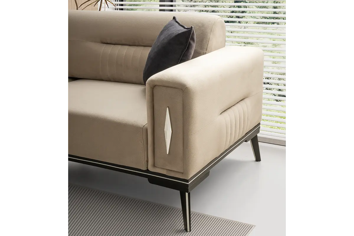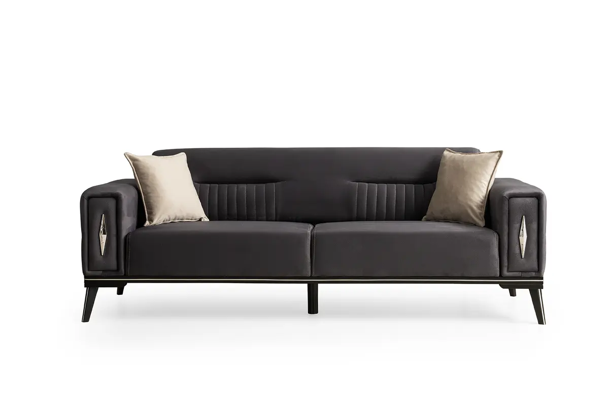 Kollar ve sırtlarda yer alan dikey kapitone kanallar, koleksiyonun imza detayı olan metal apliklerle tamamlanır. Sırt minderi ileri-geri hareket ederek düz platform oluşturur; üçlü kanepe kısa sürede yatak moduna geçer.