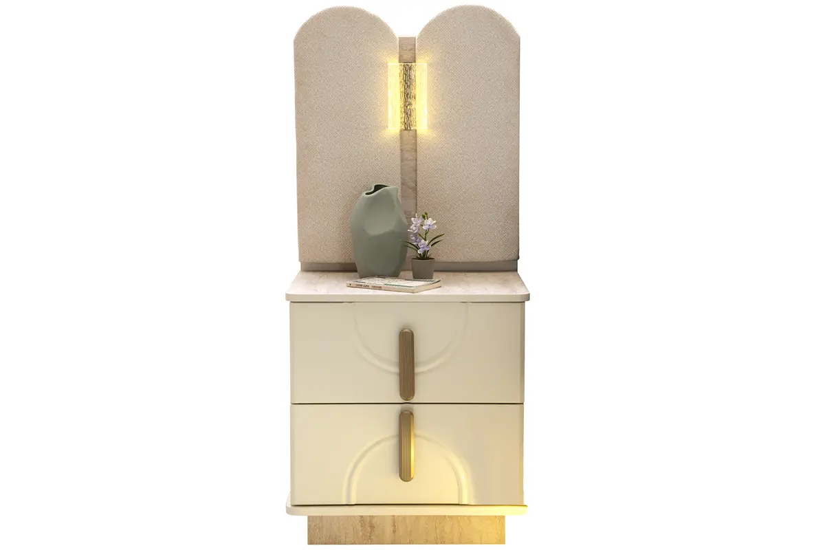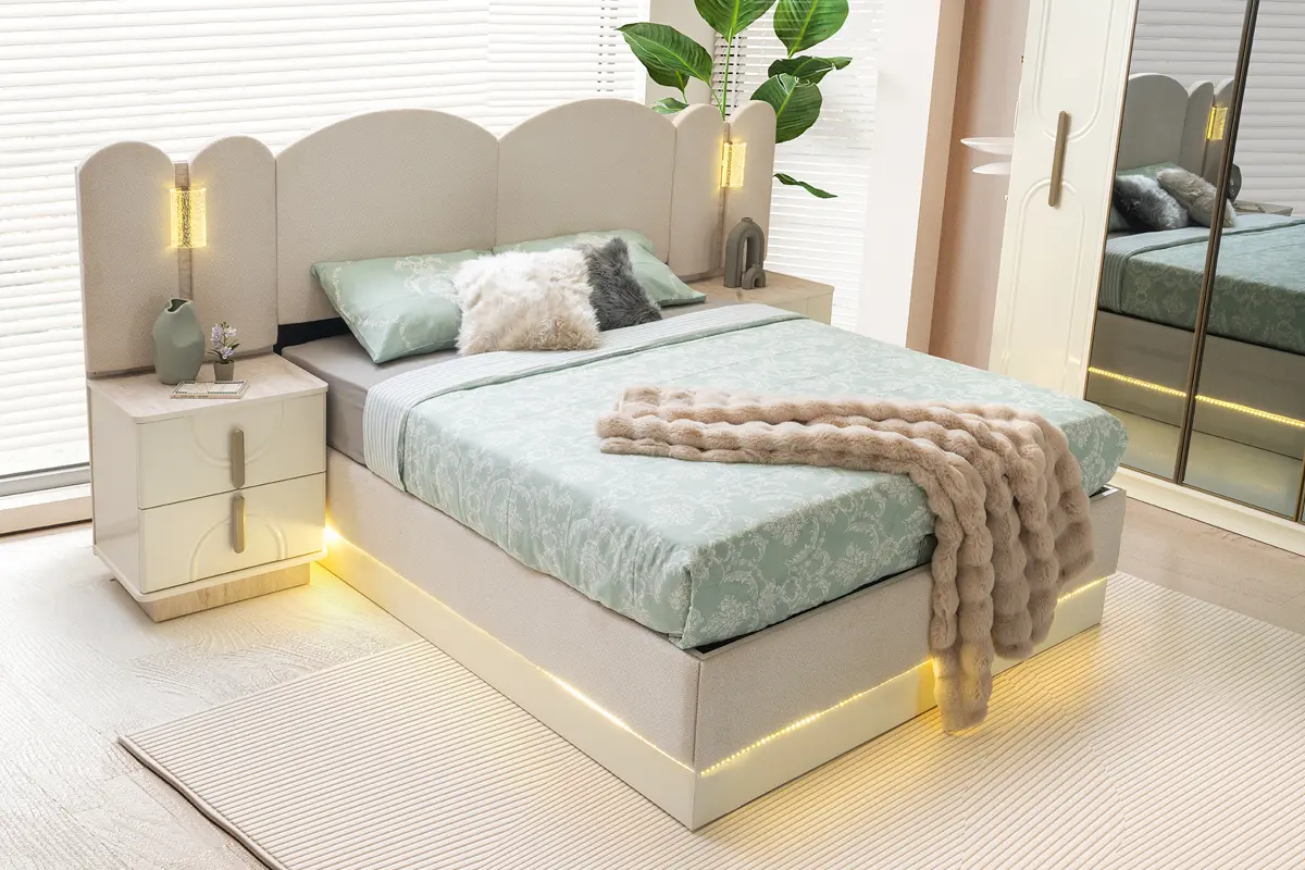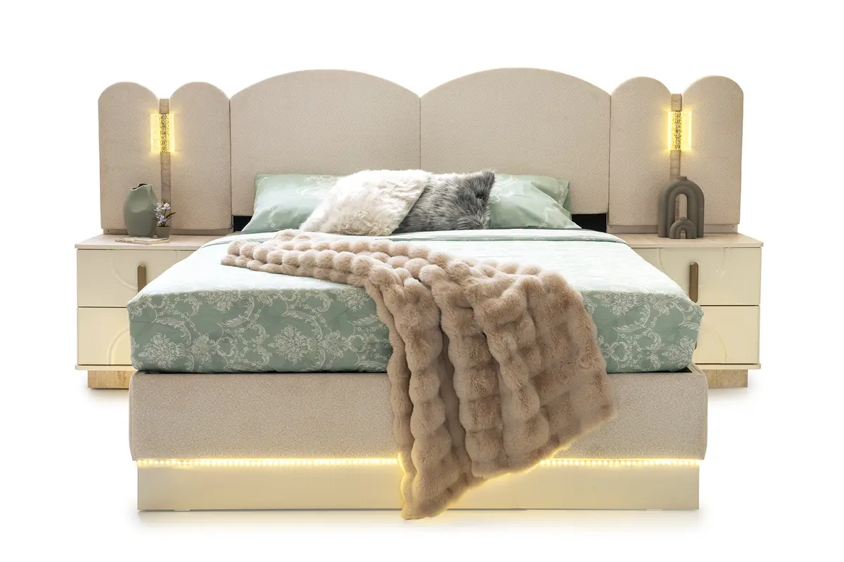 💡 Entegre Led Aydınlatma: Başlık kısmındaki dekoratif aydınlatmalar ve bazadaki LED ışık detayı, şık bir ambiyans oluşturur.