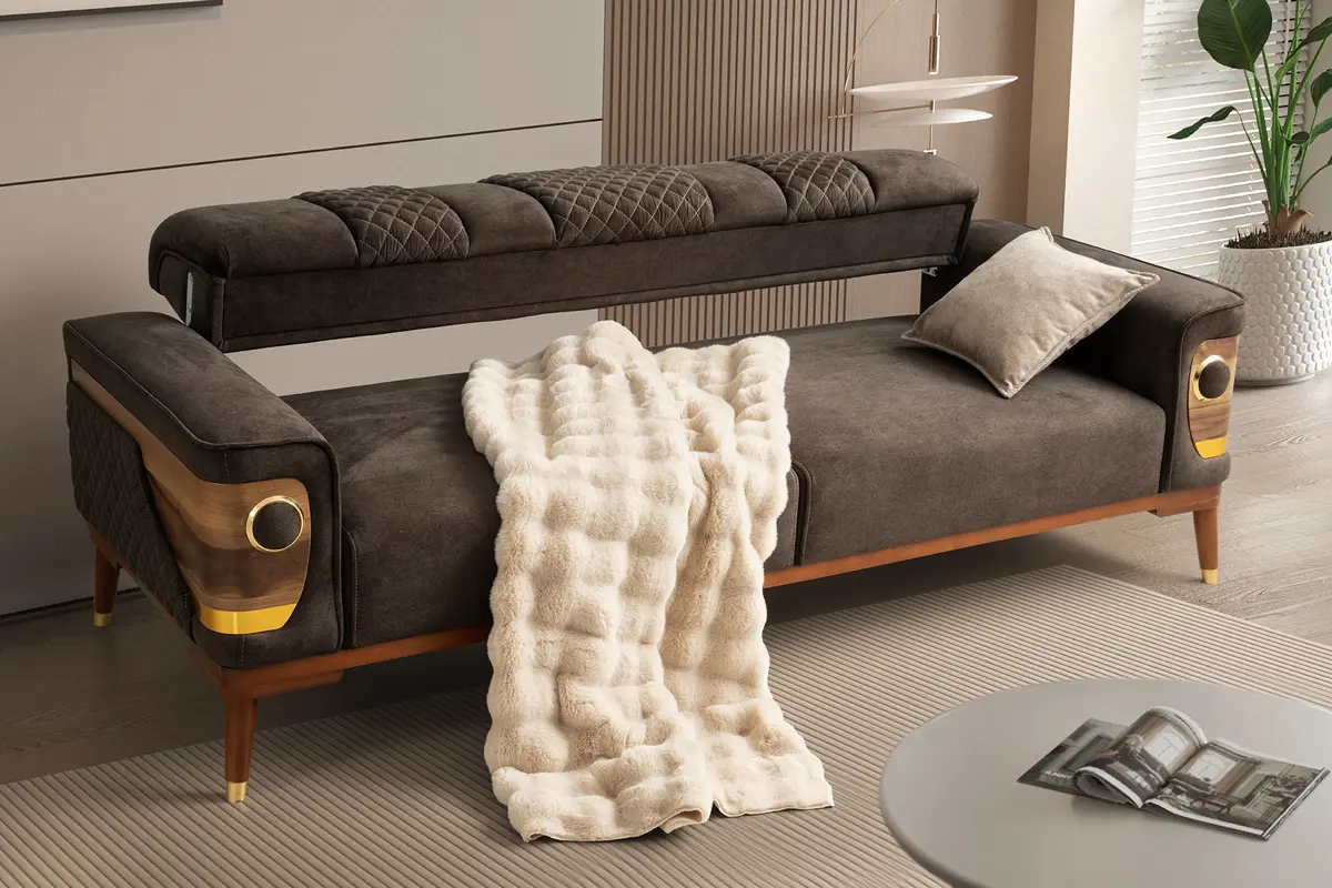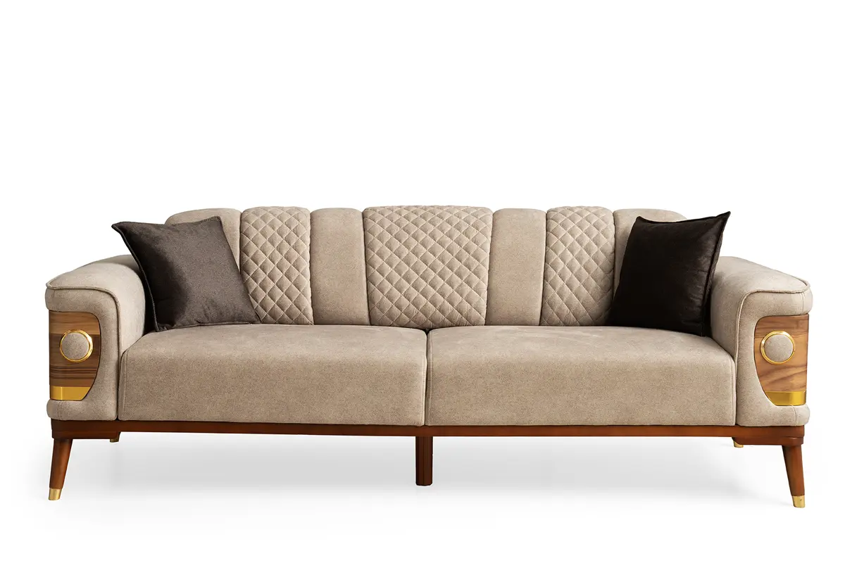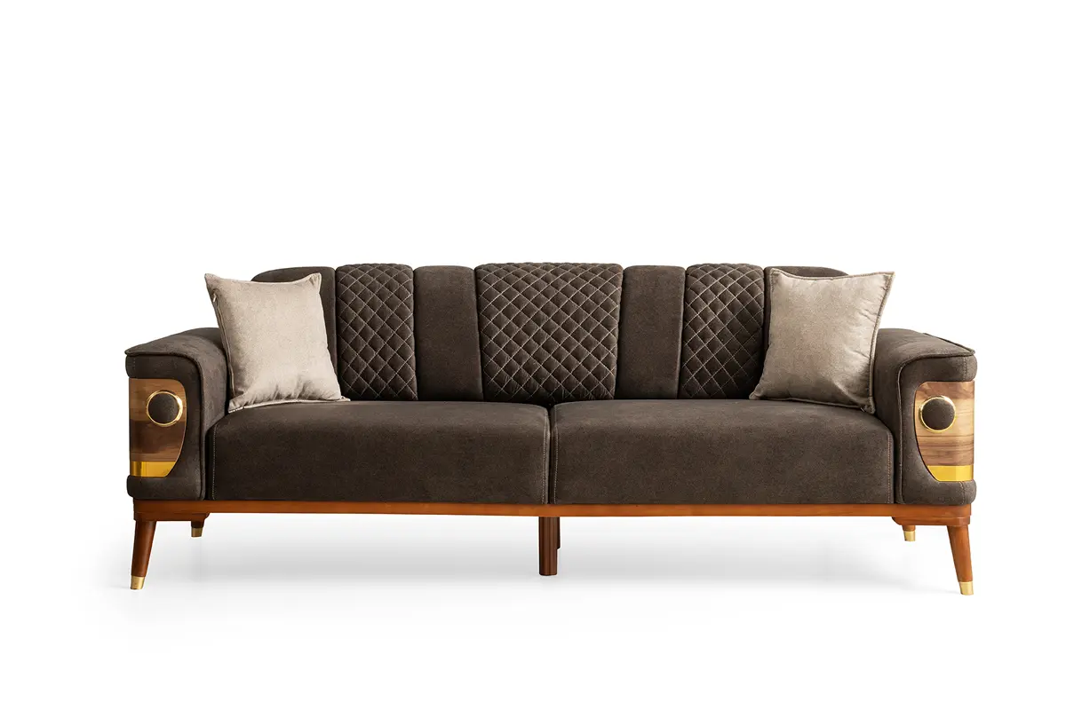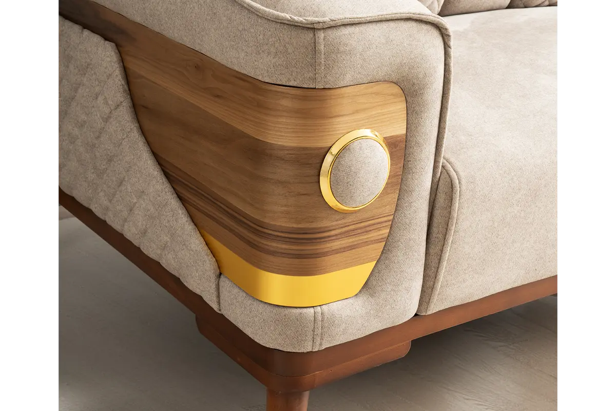 Kanepenin sırt bölümünde elmas (kapitone) dikiş panelleri ve düz orta parçalarla zengin bir ritim yakalanır. Kolların dış yüzeyindeki ceviz kaplama yan panel, gold çerçeve ve rozet detayları ile vitrin etkisi yaratır. İnce konik ahşap ayaklar gold uçla tamamlanır; yerden yüksek kurgu sayesinde alt temizliği son derece pratiktir.