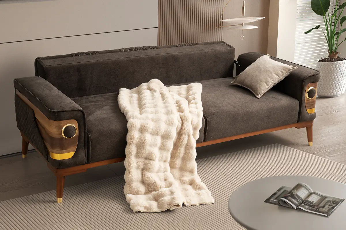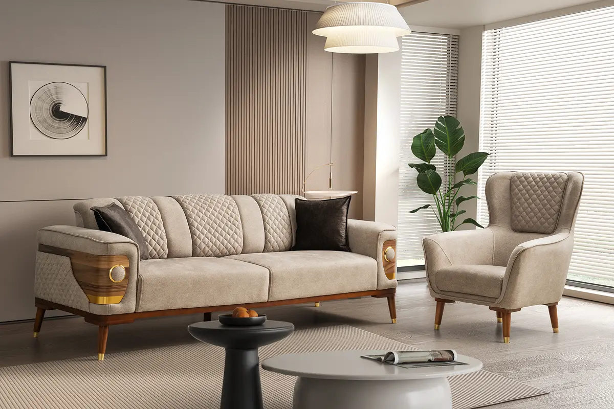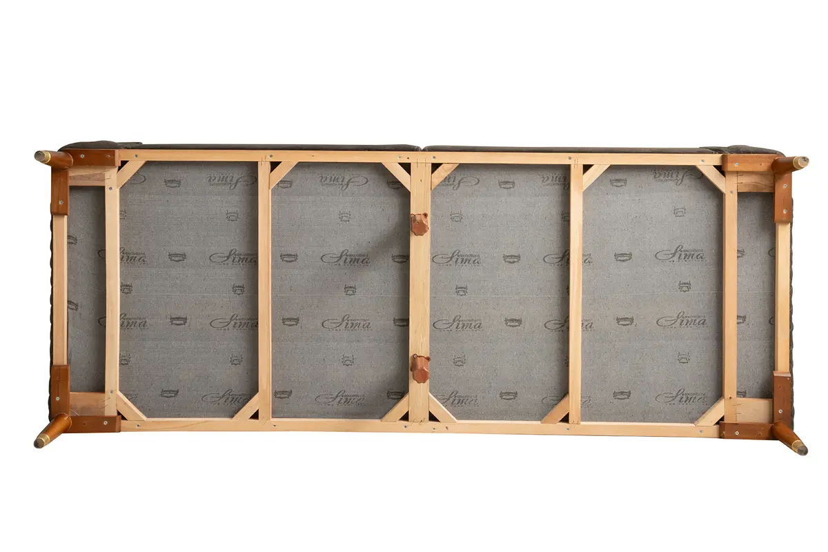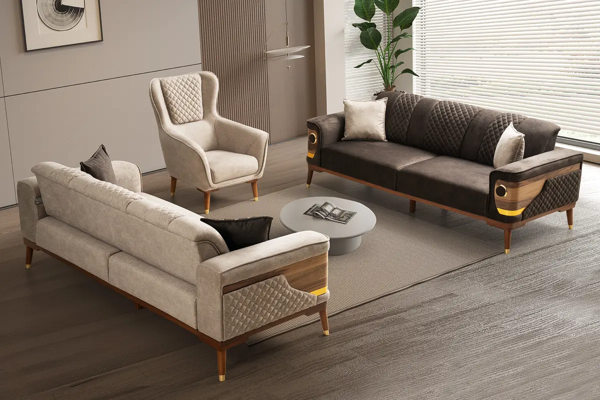 Kanepenin sırt bölümünde elmas (kapitone) dikiş panelleri ve düz orta parçalarla zengin bir ritim yakalanır. Kolların dış yüzeyindeki ceviz kaplama yan panel, gold çerçeve ve rozet detayları ile vitrin etkisi yaratır. İnce konik ahşap ayaklar gold uçla tamamlanır; yerden yüksek kurgu sayesinde alt temizliği son derece pratiktir.