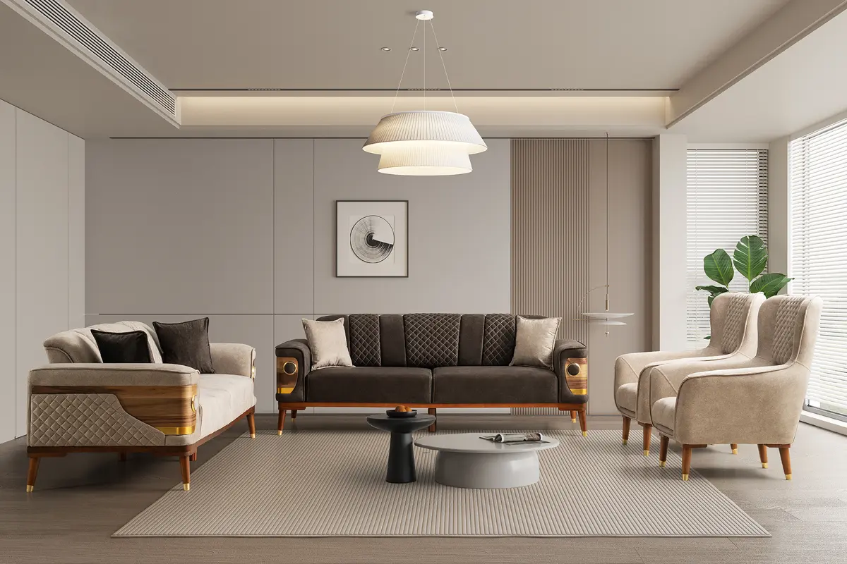Rixos Salon Takımı, modern-klasik çizgiyi doğal ceviz dokusu ve gold aksanlarla buluşturan rafine bir tasarımdır. Fırınlanmış gürgen ağacından üretilen iskelet, gövde boyunca stabilite sağlayarak uzun yıllar güvenle kullanım sunar. 34 DNS yoğunluklu oturum süngerleri, yumuşaklık ve form dayanımını dengeler; günlük kullanımda çökme yapmadan konforu korur.