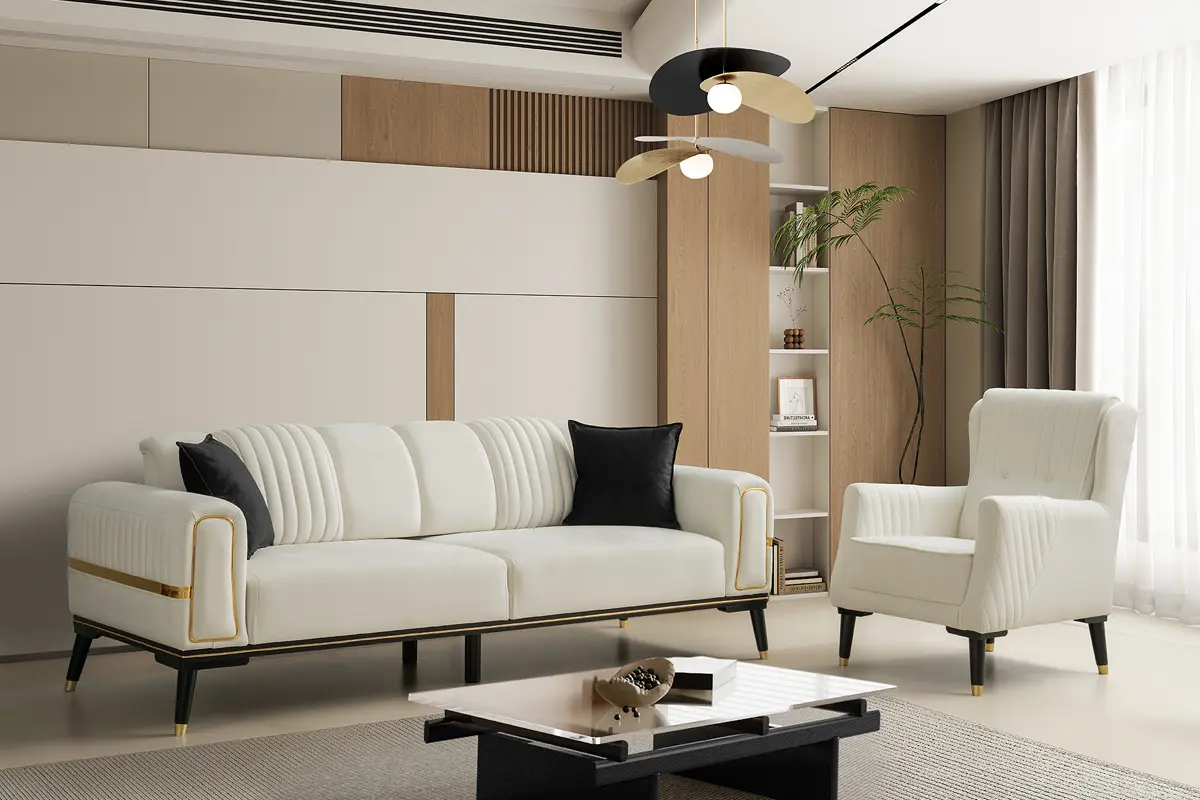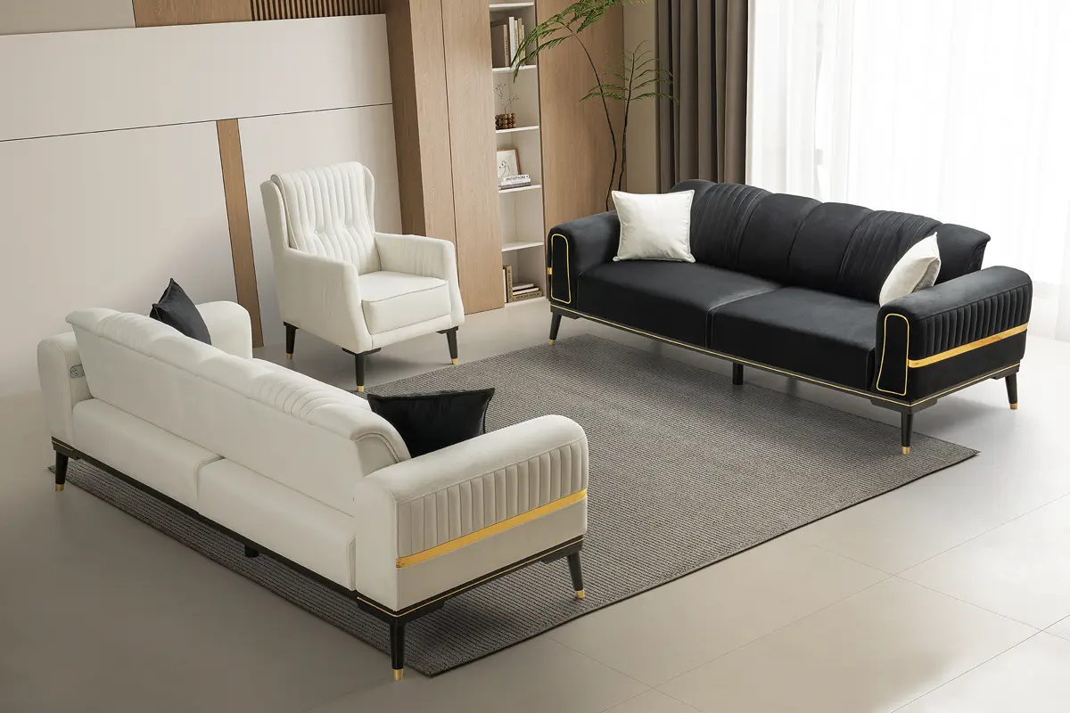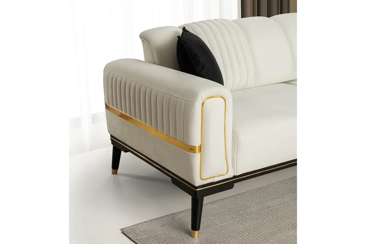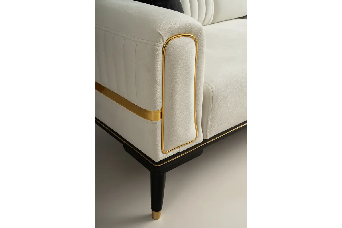 Venüs Koltuk Takımı, modern lüksü altın aksanlarla öne çıkaran sofistike bir tasarıma sahip. Fırınlanmış gürgen ağacından üretilen sağlam iskelet, 34 DNS yoğunluklu oturum süngerleriyle dengeli yumuşaklık ve form dayanımı sunar. Yerden yüksek ince formlu ayaklar, alt temizliğini kolaylaştırırken, ayak uçlarındaki gold kaplamalar ve şase boyunca devam eden altın hatlar takıma seçkin bir karakter kazandırır.