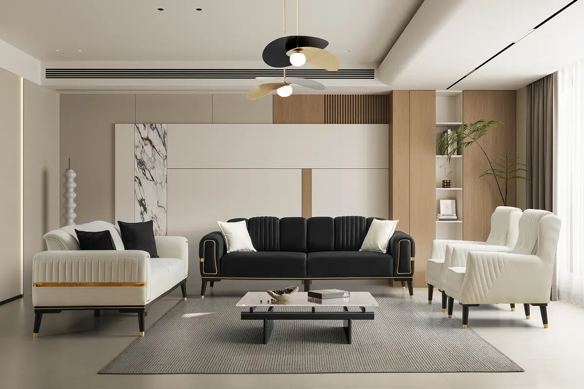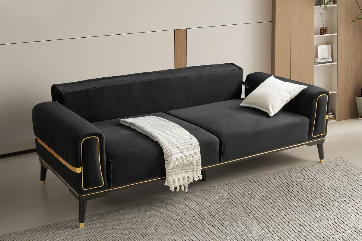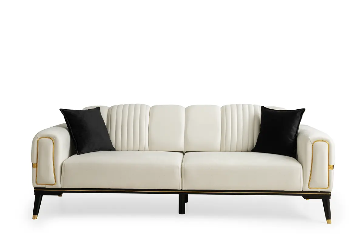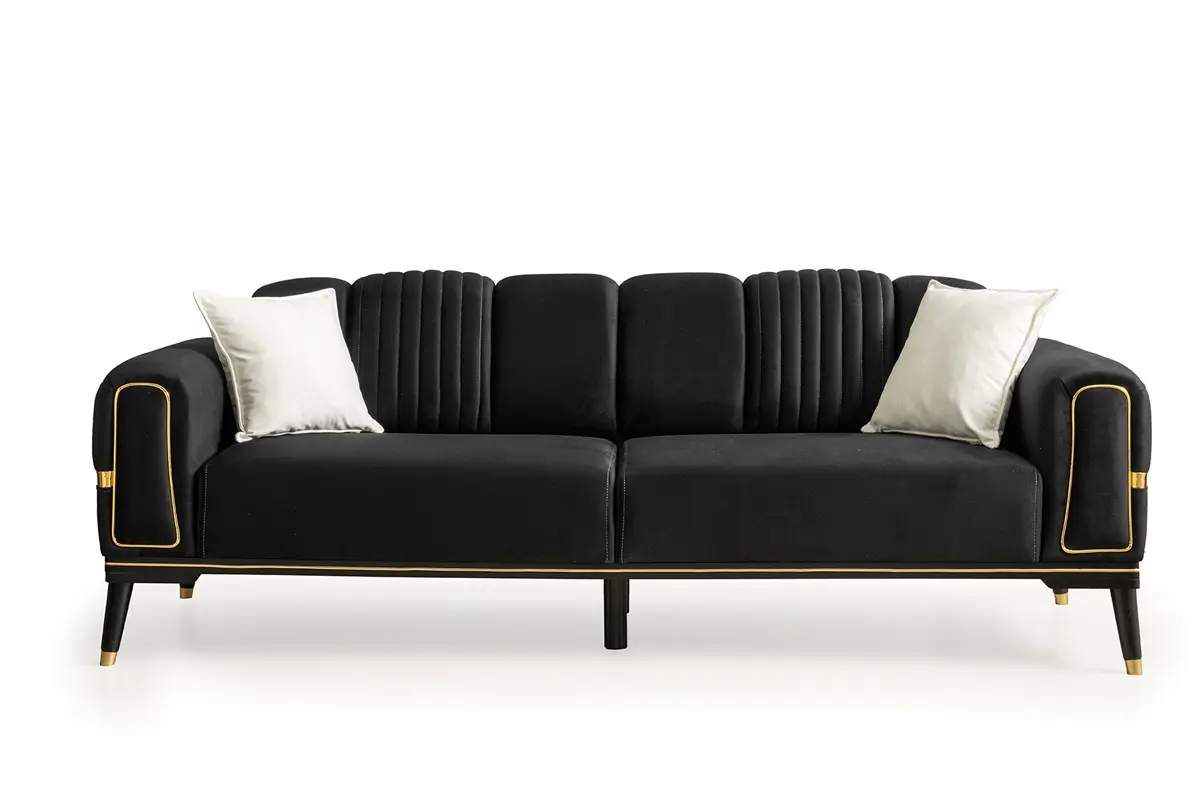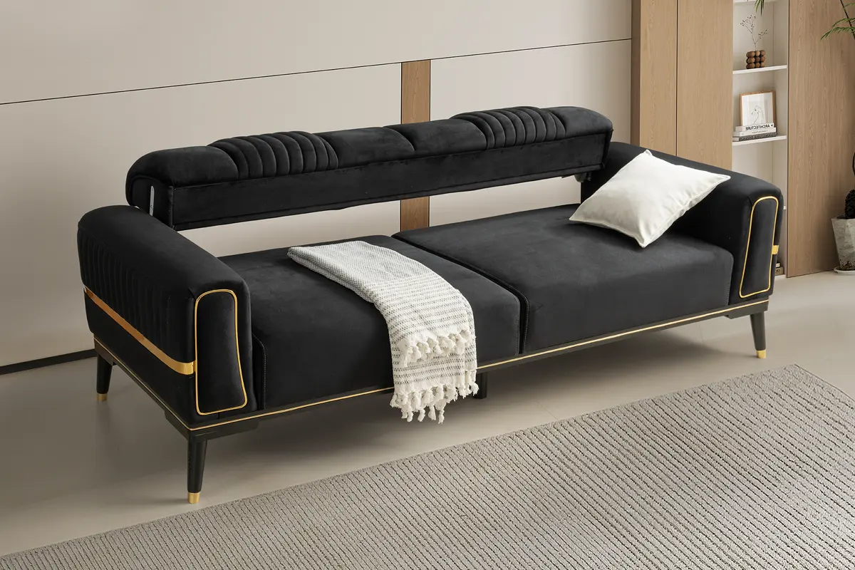 Venüs Koltuk Takımı, modern lüksü altın aksanlarla öne çıkaran sofistike bir tasarıma sahip. Fırınlanmış gürgen ağacından üretilen sağlam iskelet, 34 DNS yoğunluklu oturum süngerleriyle dengeli yumuşaklık ve form dayanımı sunar. Yerden yüksek ince formlu ayaklar, alt temizliğini kolaylaştırırken, ayak uçlarındaki gold kaplamalar ve şase boyunca devam eden altın hatlar takıma seçkin bir karakter kazandırır.