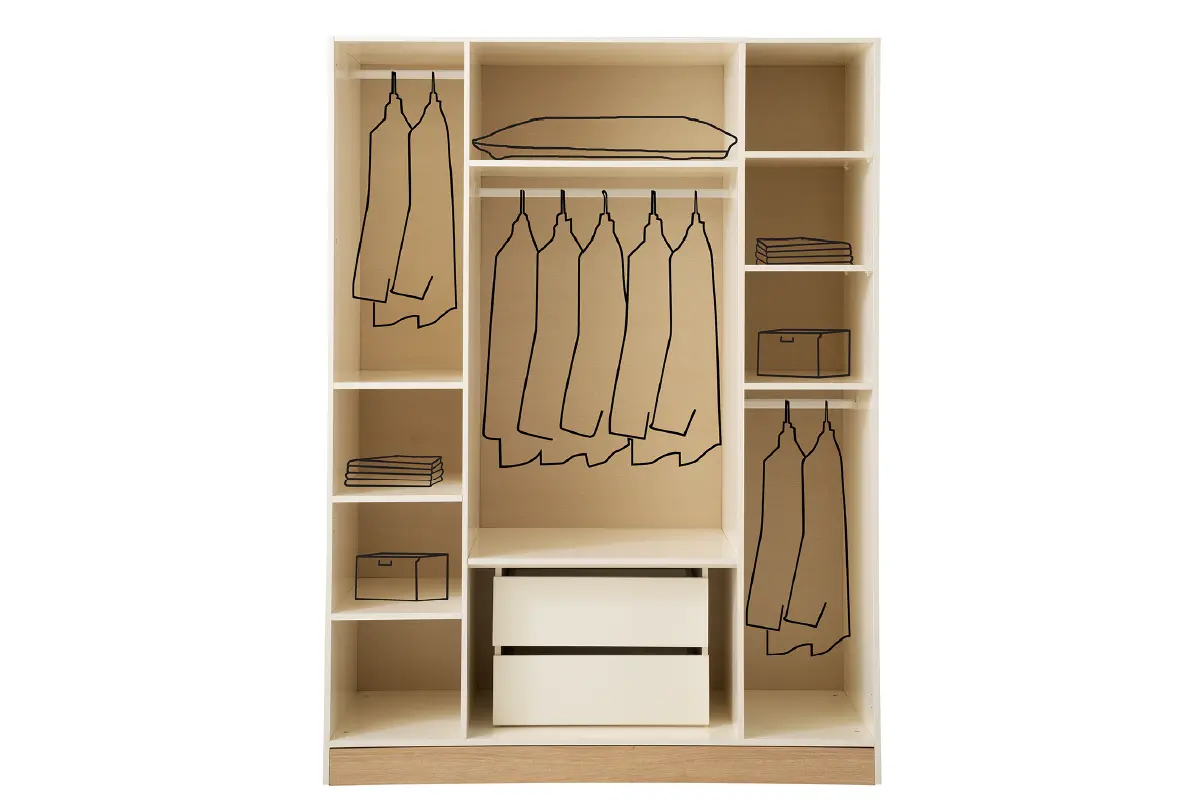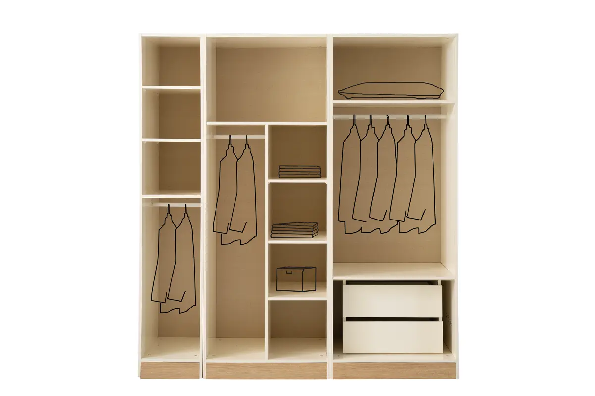 Akıllı iç düzen: askı boruları, geniş raflar ve opsiyonel çekmece–pantolonluk üniteleri ile kişiselleştirilebilir depolama.