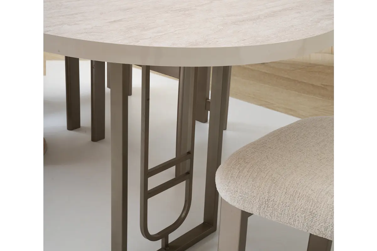 ✦ Açık bej tonlarında taş dokulu masa tablası ve yuvarlatılmış köşeler, mekâna sakin bir “zen” atmosferi katar.
